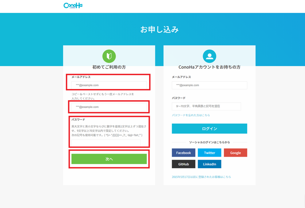 「初めてご利用の方」欄にメールアドレスとパスワードを入力。入力したら、「次へ」をクリックします!