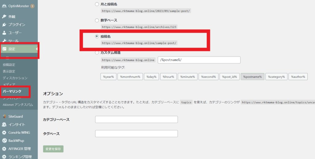 「設定」→「パーマリンク設定」→「パーマリンク構造」→「投稿名」にチェックを入れ、「変更を保存」をクリック。