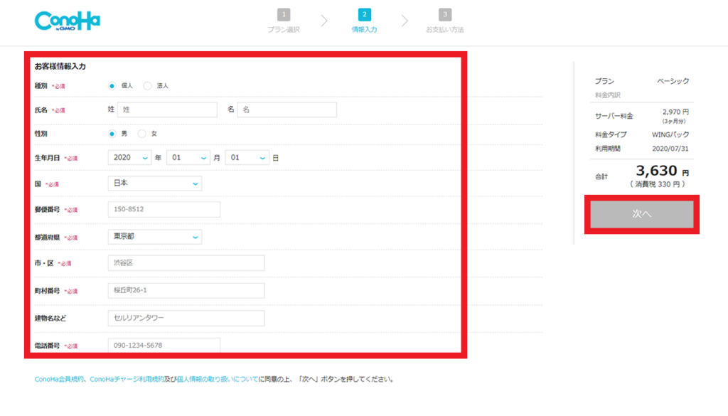 お客様情報をすべて入力したら、「次へ」