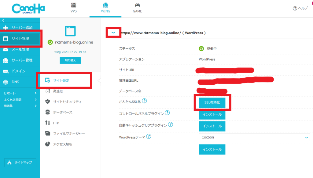 ConoHaの「サイト管理」→「サイト設定」の手順で進み、サイトURLをクリックします。